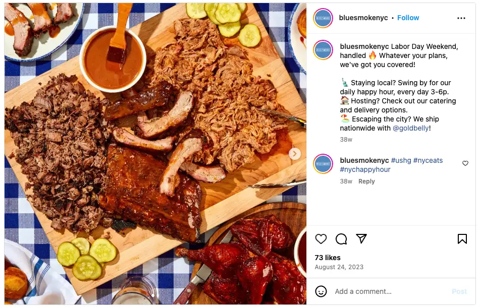 Blue Smoke posted on Instagram and shared all of the ways diners can interact with the restaurant over the holiday including visiting in person, ordering catering or delivery, and snagging a shipment of barbecue.