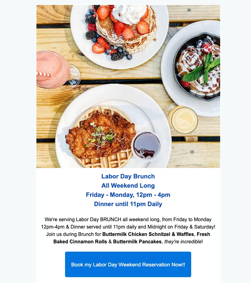 Loreley Beer Garden sent an email to their newsletter subscribers promoting their four-day brunch special. What works well about the email is a high-quality featured image, a single paragraph of content that highlights the menu items, and a prompt to book a reservation.
