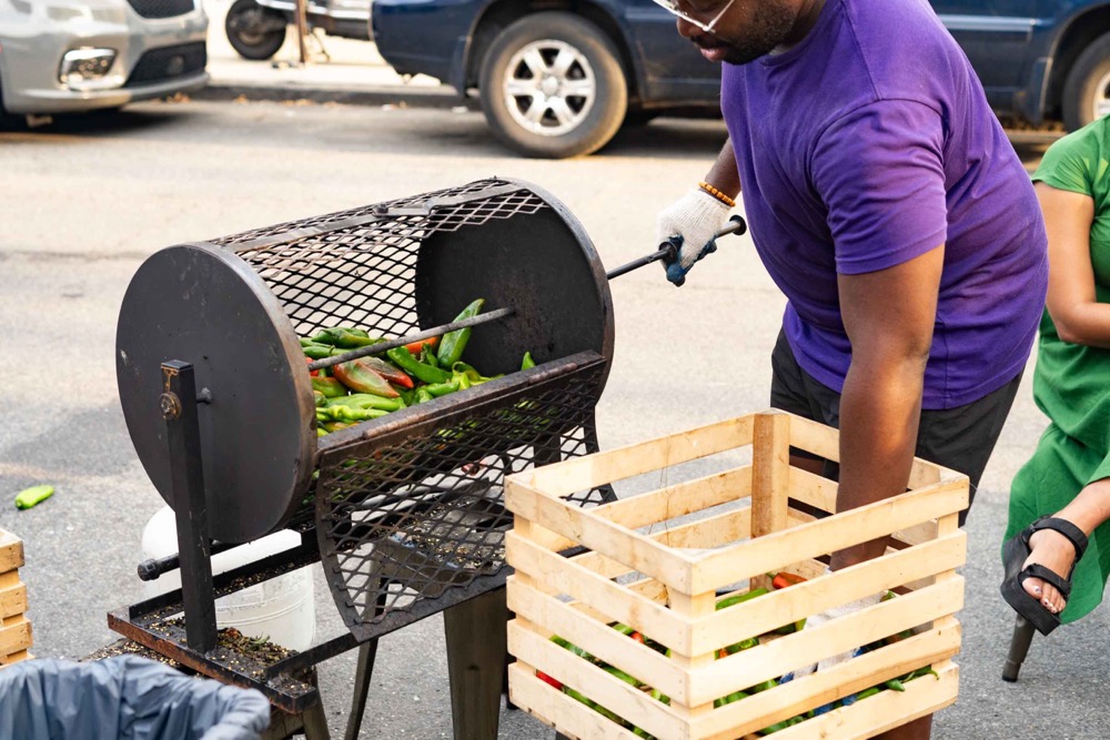 On a steamy summer Tuesday in Williamsburg, a crowd of hundreds snaked around the block to get near the only thing hotter than the ambient air temperature: the big propane-fired barrel roaster in which half a ton of green New Mexico chiles would meet their fate.