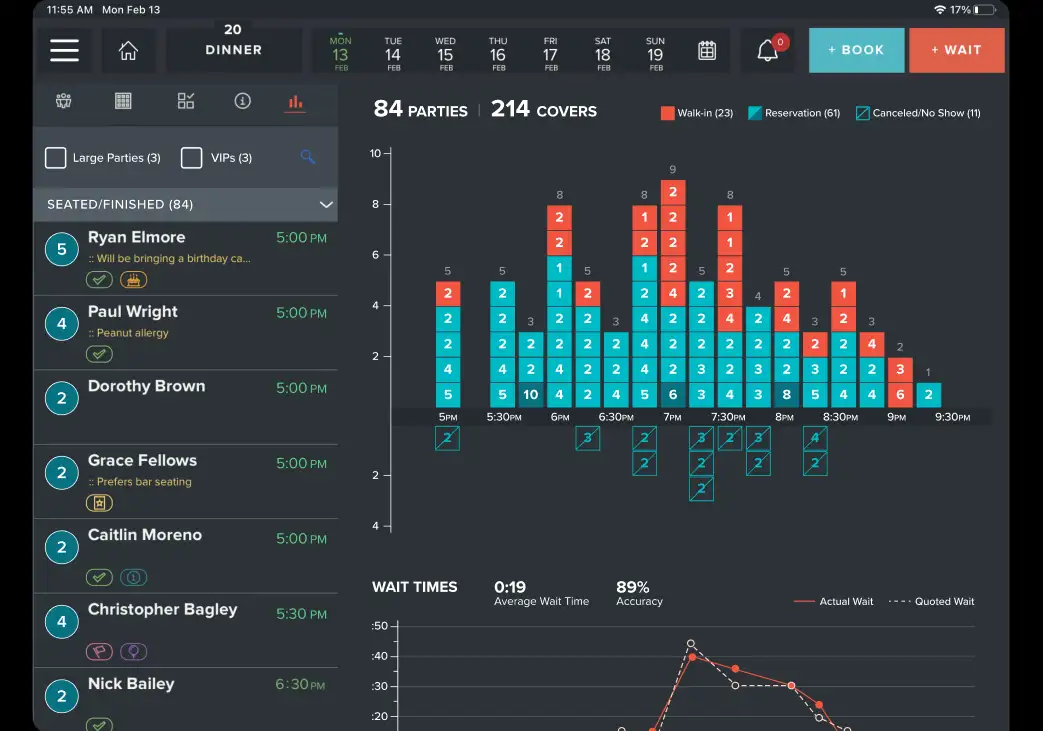 The reporting feature will populate based on the time of day, enabling you to view a list of your total parties for the day, including VIP guests, as well as the spread of covers for a pre-shift overview. The post-shift report will provide analytics on your wait time (actual vs. quoted) and average turn times.