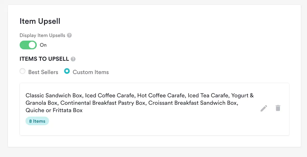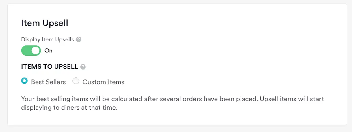 The new feature enables restaurants to capture additional revenue at checkout by highlighting specific menu items or displaying “best sellers.” Best sellers are automatically configured based on sales data while Custom Items must be manually selected. You can toggle off/on at the menu level through your dashboard.